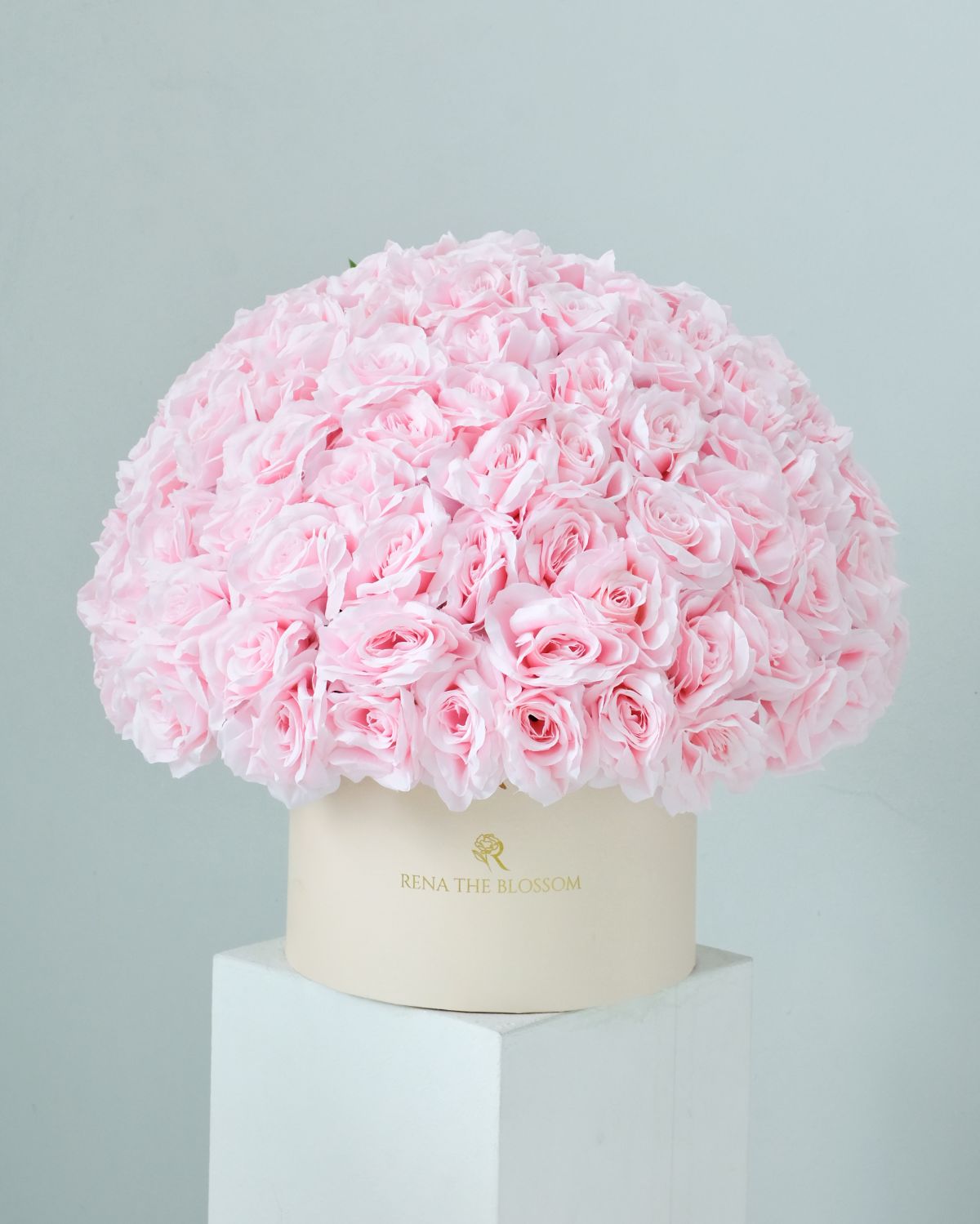 “Eighty artificial pink roses in a bloom box — the number that sits between intimate and grand. Permanent, beautiful, and exactly the right amount.”