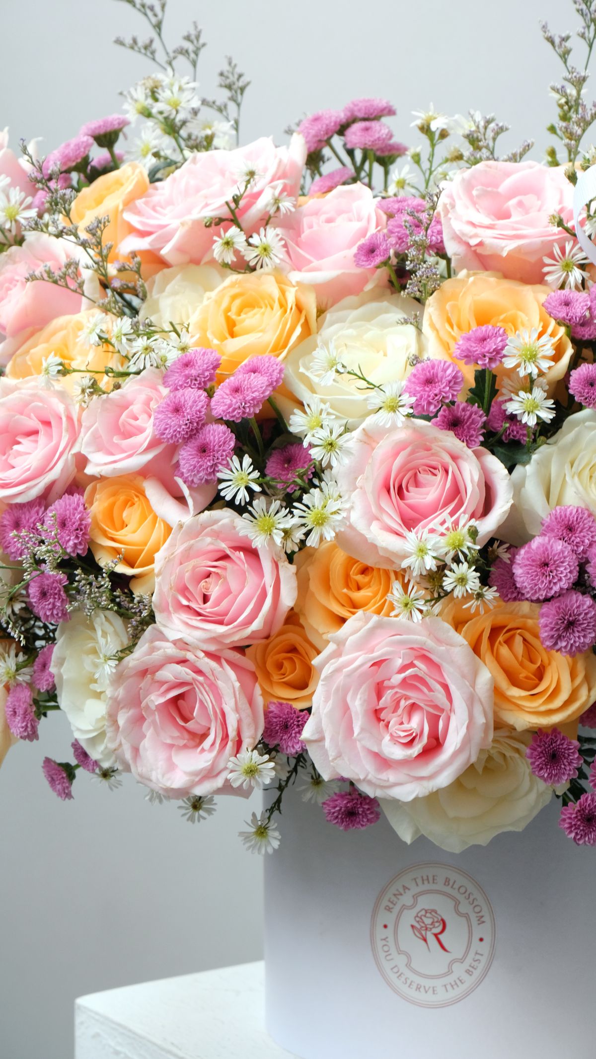 “Pink, white, and peach roses with calimero and soft caspea, gathered like clouds at dusk — romantic, layered, and dreamily light. A bouquet that feels like it's floating.”