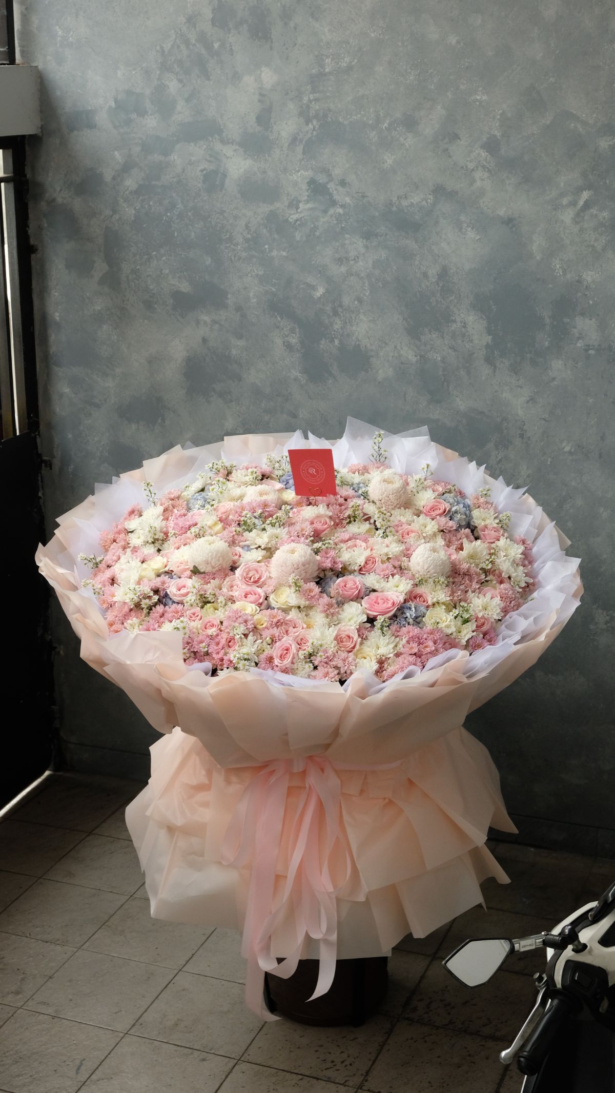 “White and pink roses, peony mum, hydrangeas, asters, and pikok spread like a field brought indoors — wide, generous, and impossibly fresh.”