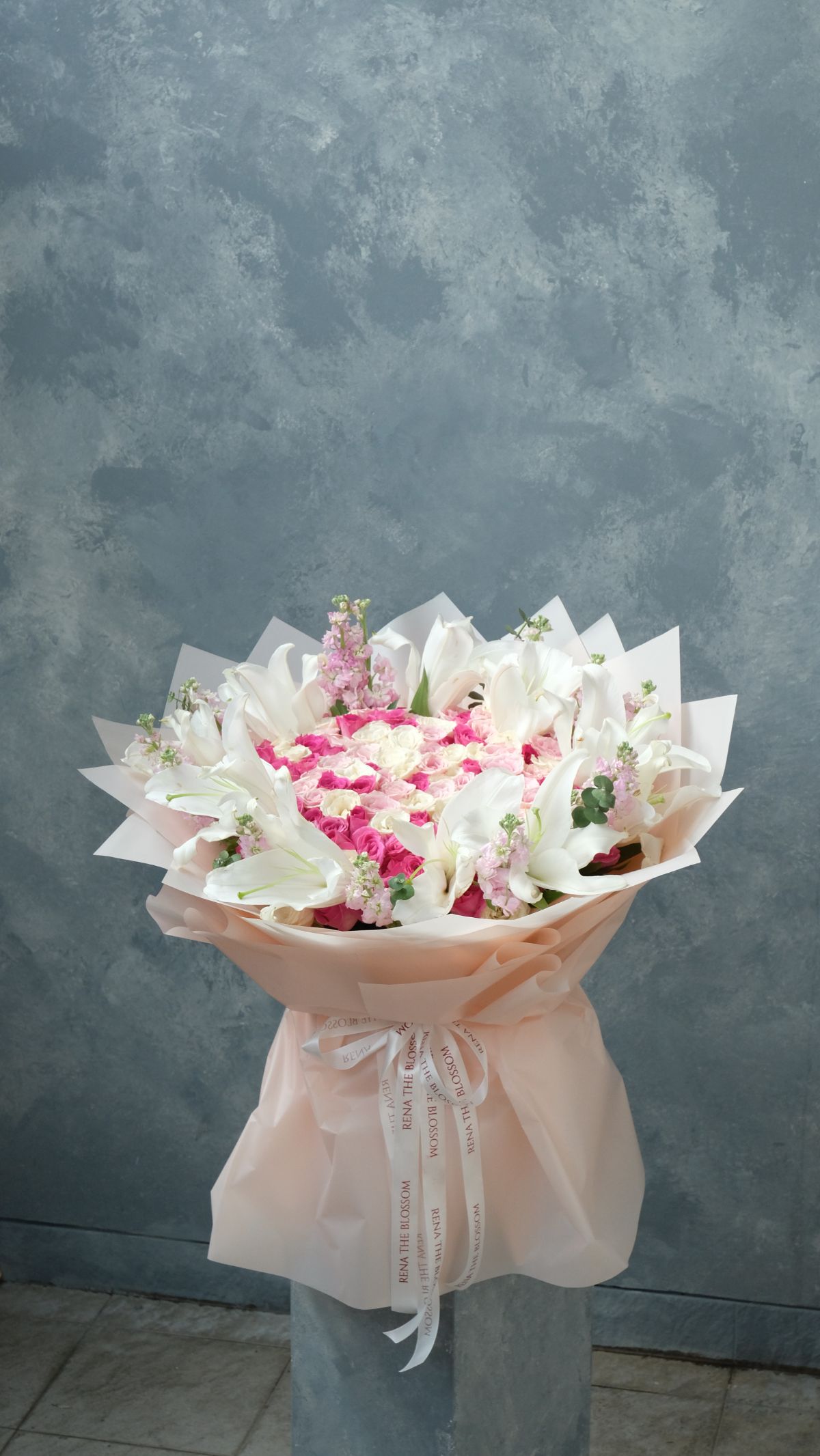 “Pink, white, and hot pink roses, matthiola, lily, and silver dollar — form and grace in constant conversation. An arrangement that achieves the rare feat of being both striking and serene.”