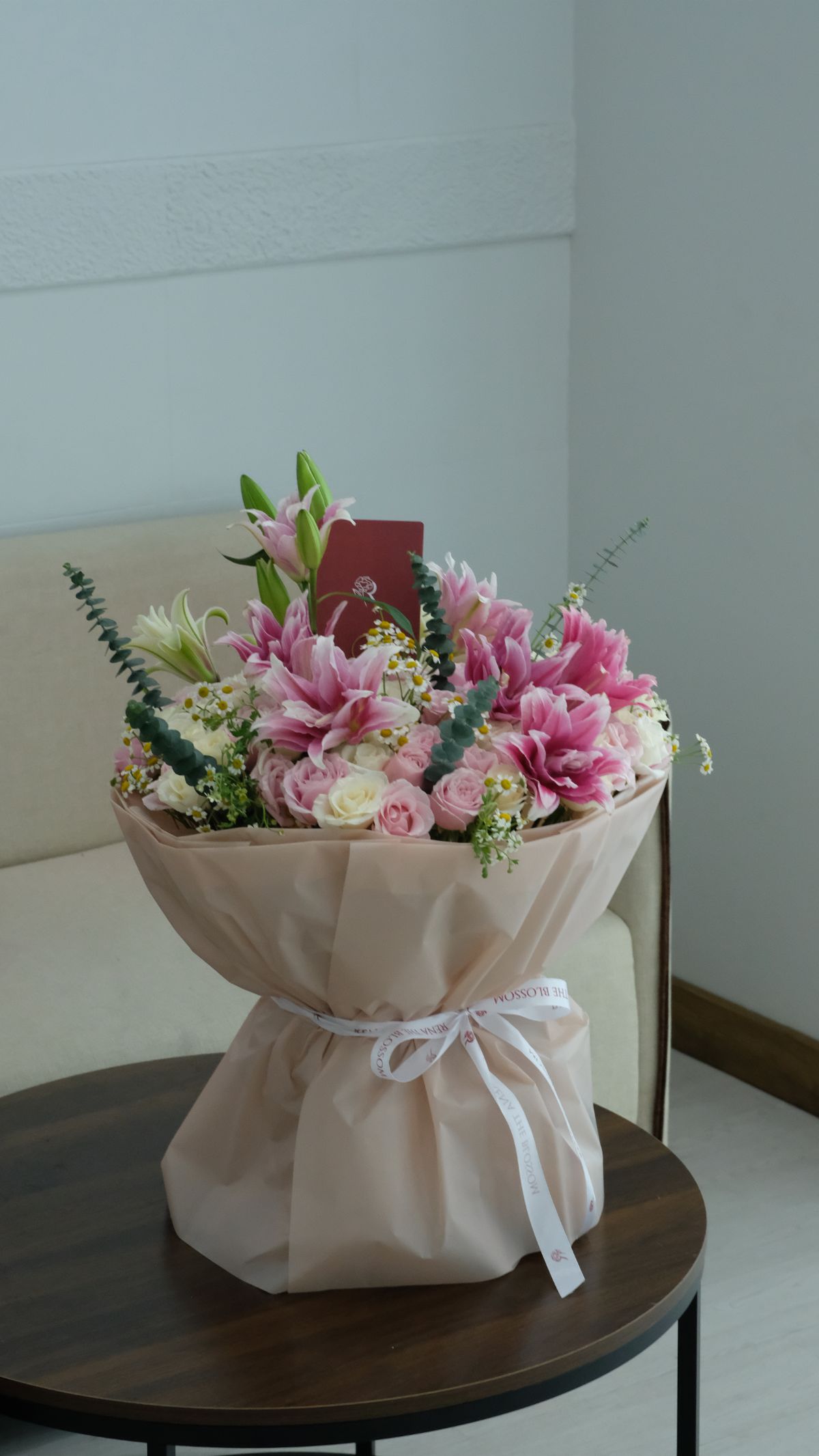 “White and pink roses, double lily, silver dollar, and chamomile — a fresh arrangement that feels like the best kind of dream, vivid and warm and full of light.”