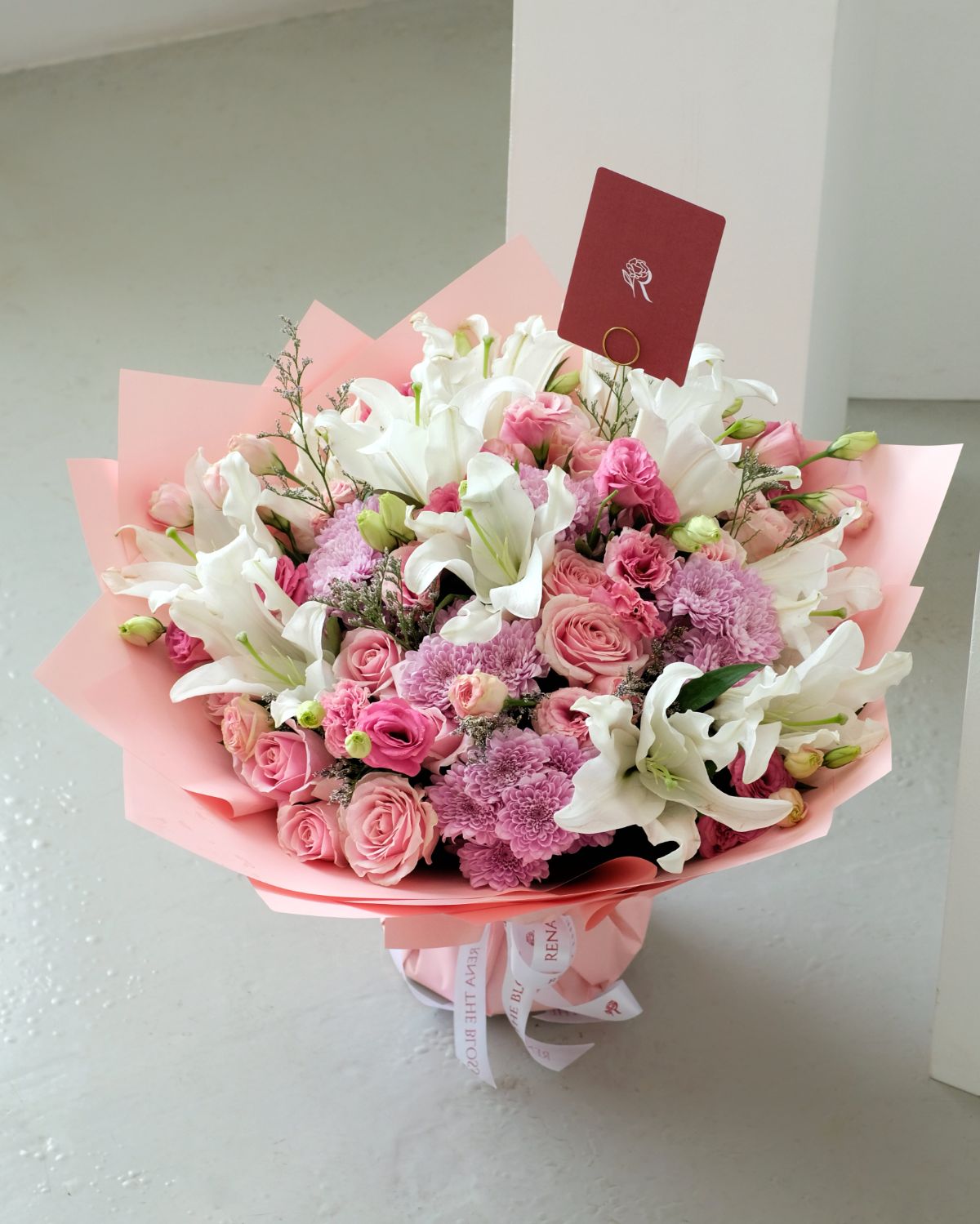“Pink roses, lisianthus, lily, caspea, and import asters in a medium arrangement — grand in ambition, precise in execution. Everything you want from a premium fresh arrangement.”
