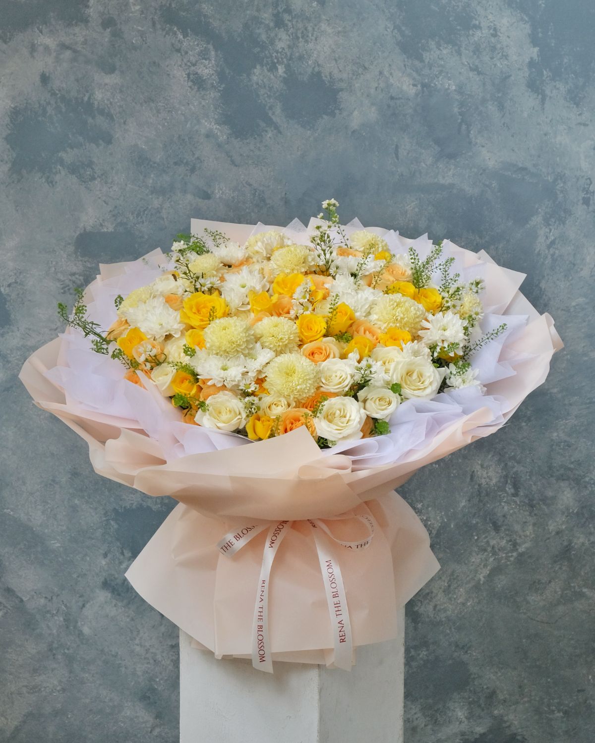 “White, peach, and yellow roses, gomphrena, pikok, asters, and thlaspi — a whimsy arrangement in the freshest, most summery palette imaginable.”