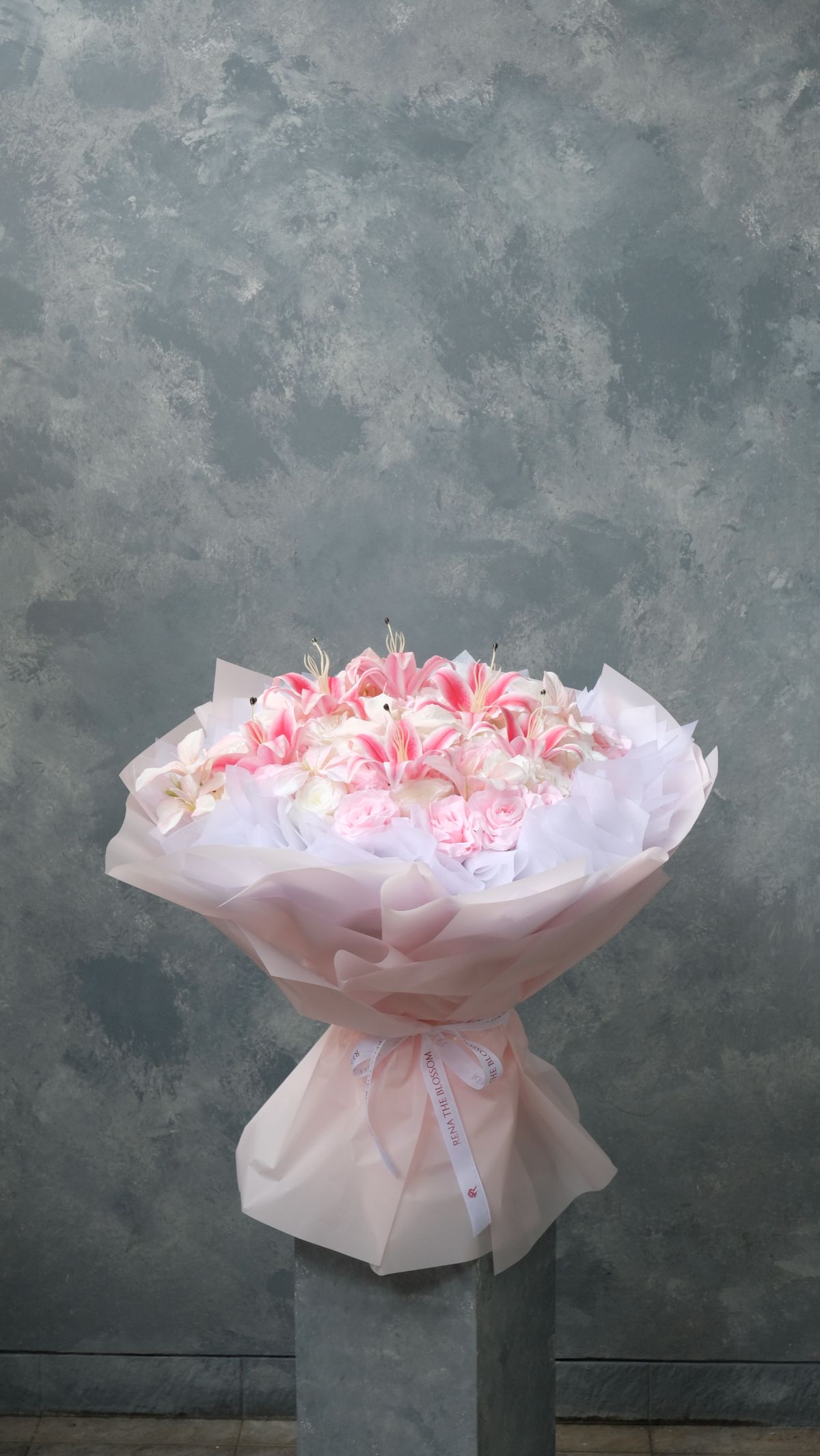 “Artificial pink and white roses, lily, and flamingo — a heaven arranged in pink and white. Soft, generous, and permanently beautiful.”