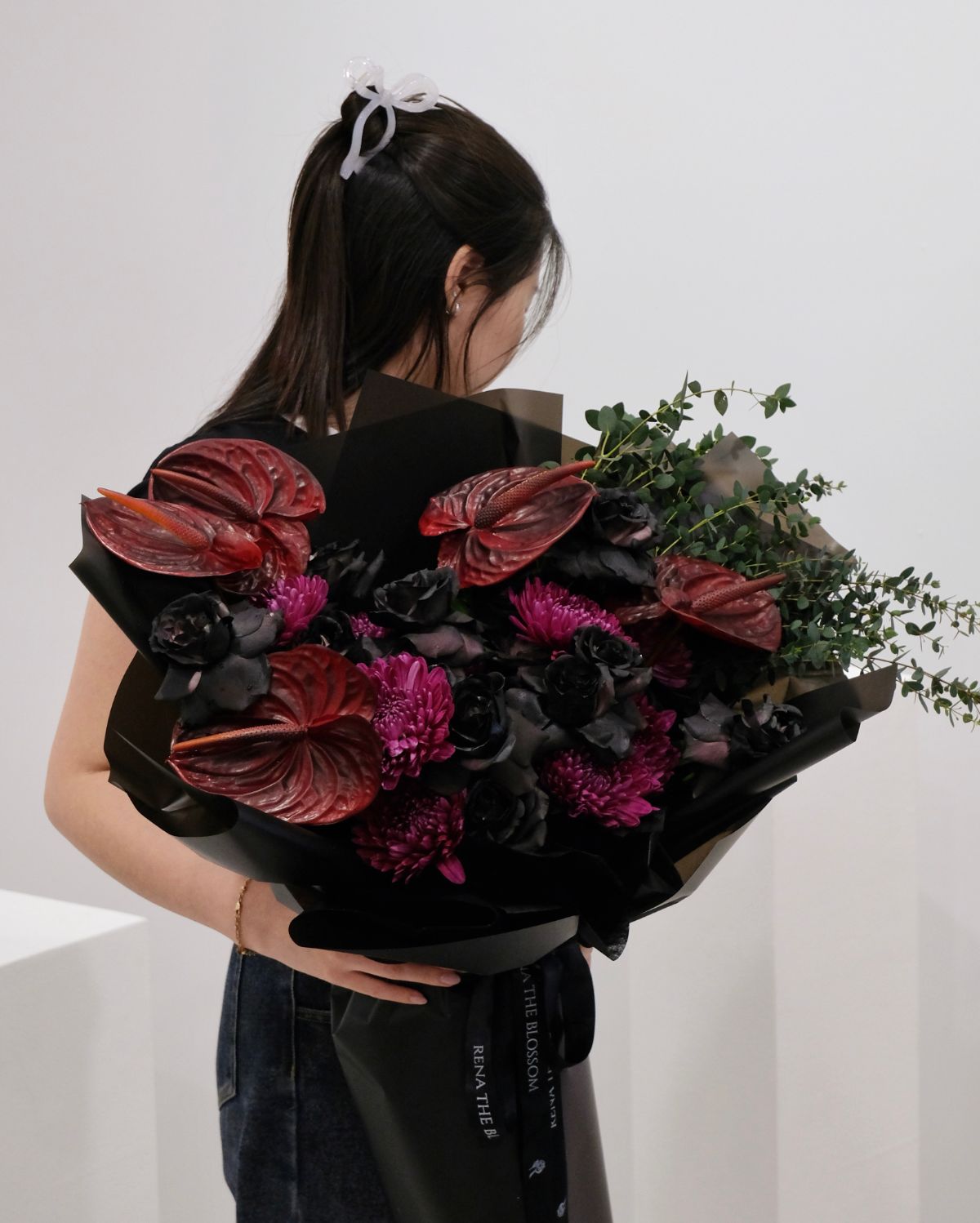 “Red anthurium, chrysanthemums, roses, and parfi — a glance from across a dark room. Rich, arresting, and full of the kind of beauty that doesn't need daylight.”