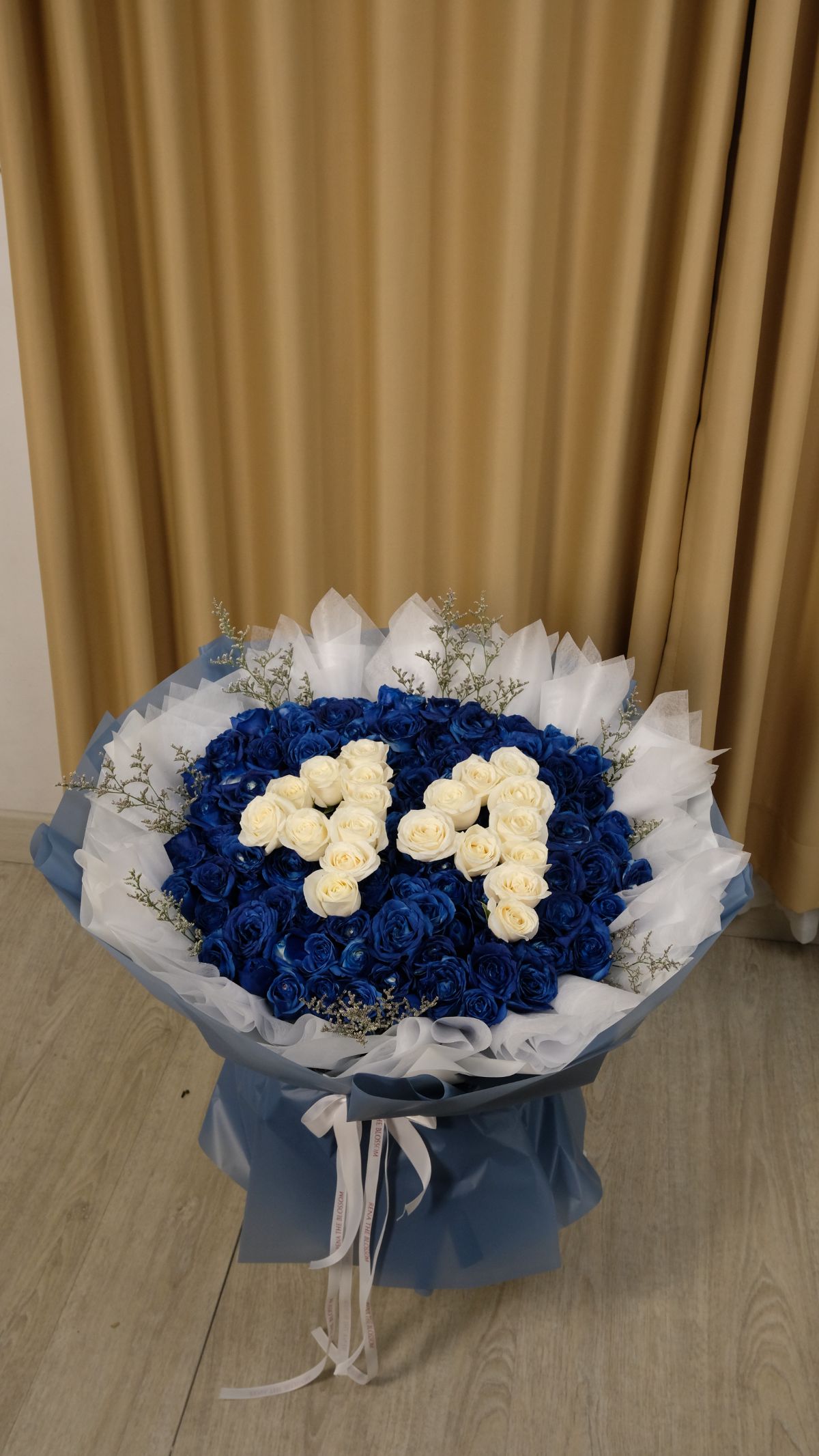 “One hundred and forty red and white roses with numbers spelled in blooms — a milestone arrangement for a milestone moment. Count the roses; feel the love.”