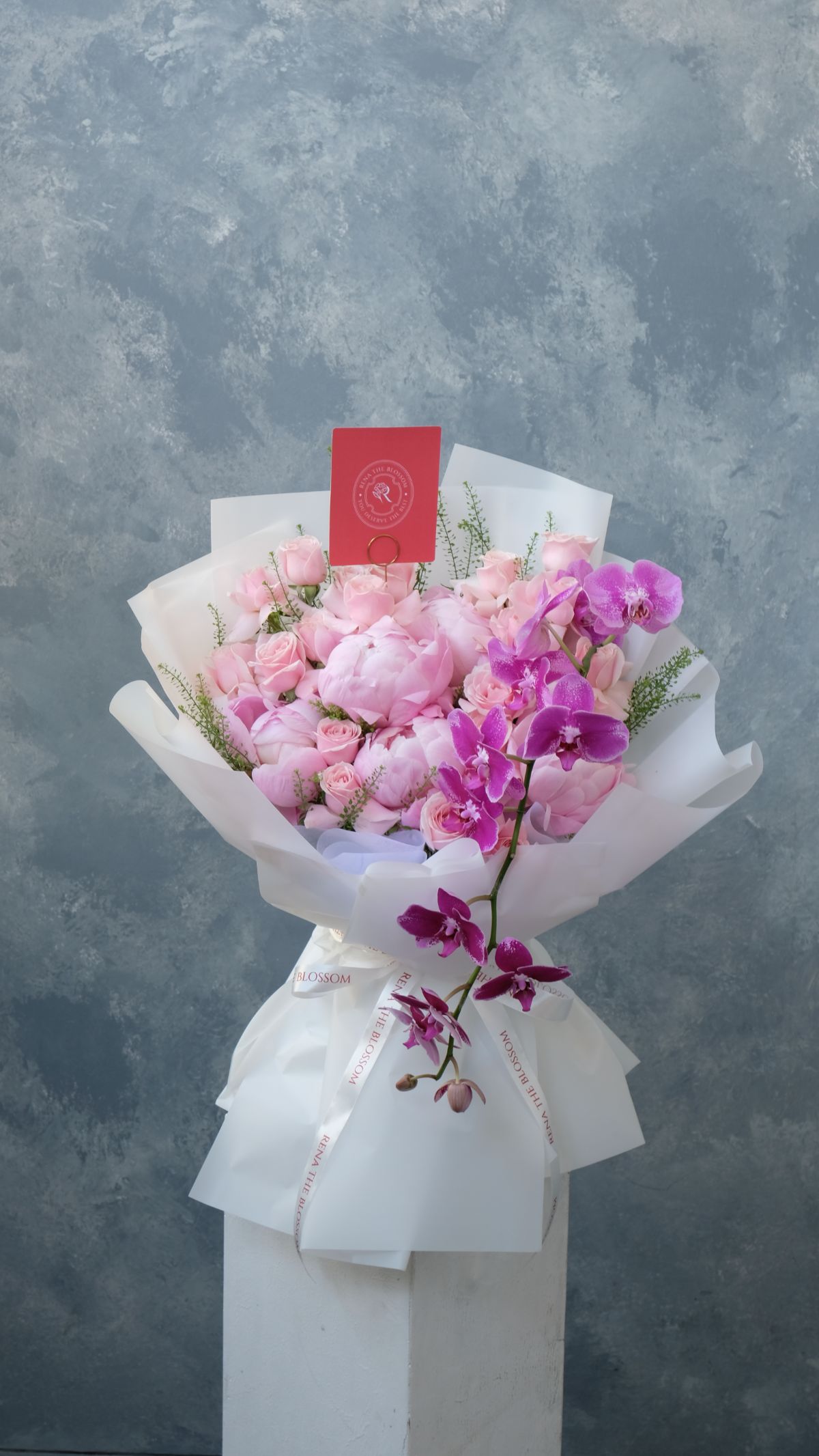 “Pink peonies, thlaspi, cascade orchids, and roses — royal in every sense. An arrangement built for grand gestures delivered with genuine elegance.”