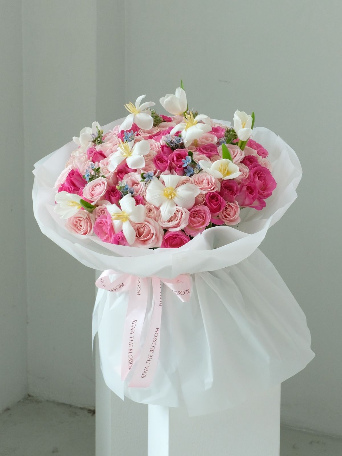 “Pink and hot pink roses, blue oxypetalum, and white tulips — loly, sweet and surprising. A large arrangement where the unexpected blue note makes everything else more beautiful.”