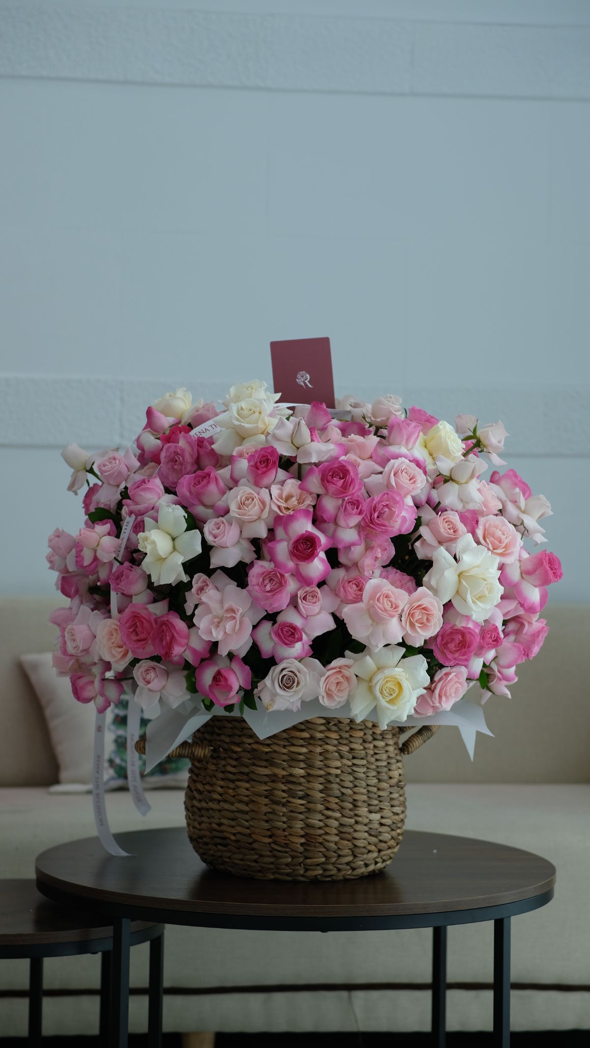 “Quicksand and White O'Hara import roses in a giant basket arrangement — premium blooms, natural vessel. The combination is as easy as it is extraordinary.”