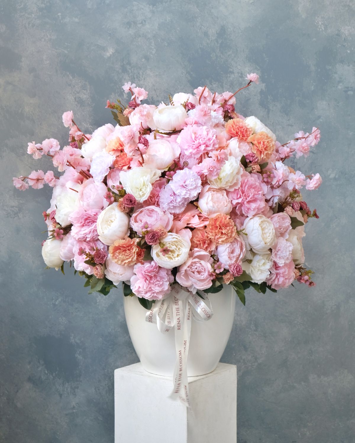 “Giant artificial peonies, lisianthus, carnations, and hydrangeas in pink — a whisper from the sakura trees, arranged at scale and preserved forever.”