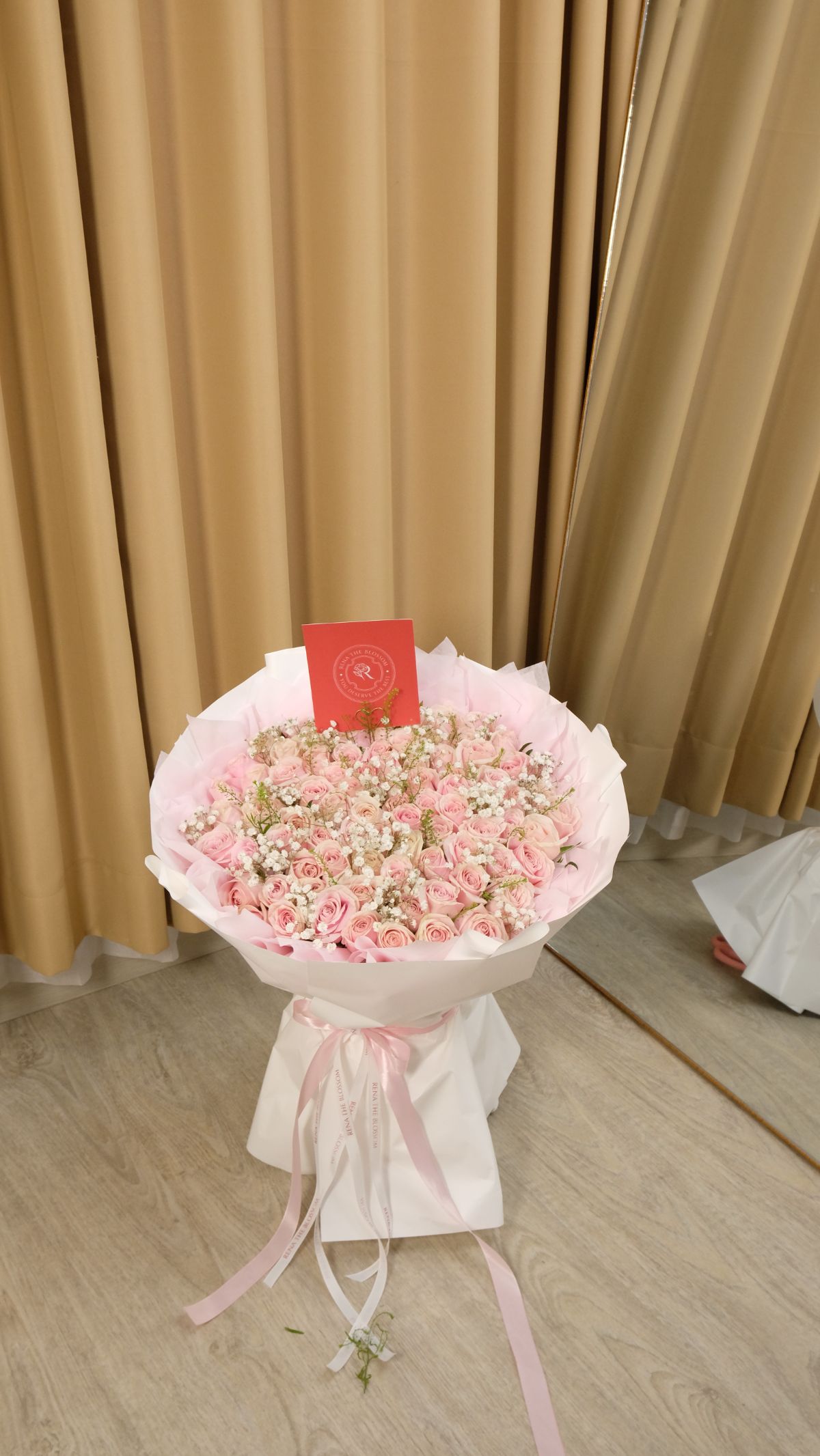 “Pink roses, baby's breath, and thlaspi in a large fresh arrangement — starlight in pink. Bright, scattered, and full of a beauty that doesn't ask permission.”