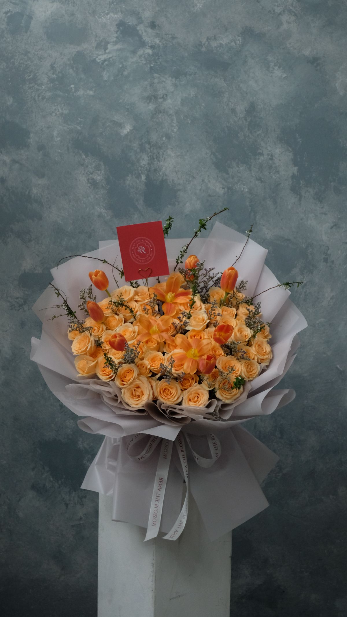 “Peach roses, tulips, caspea, and spirea — the arrangement equivalent of a perfect sunny afternoon. Light, warm, and completely without shadow.”