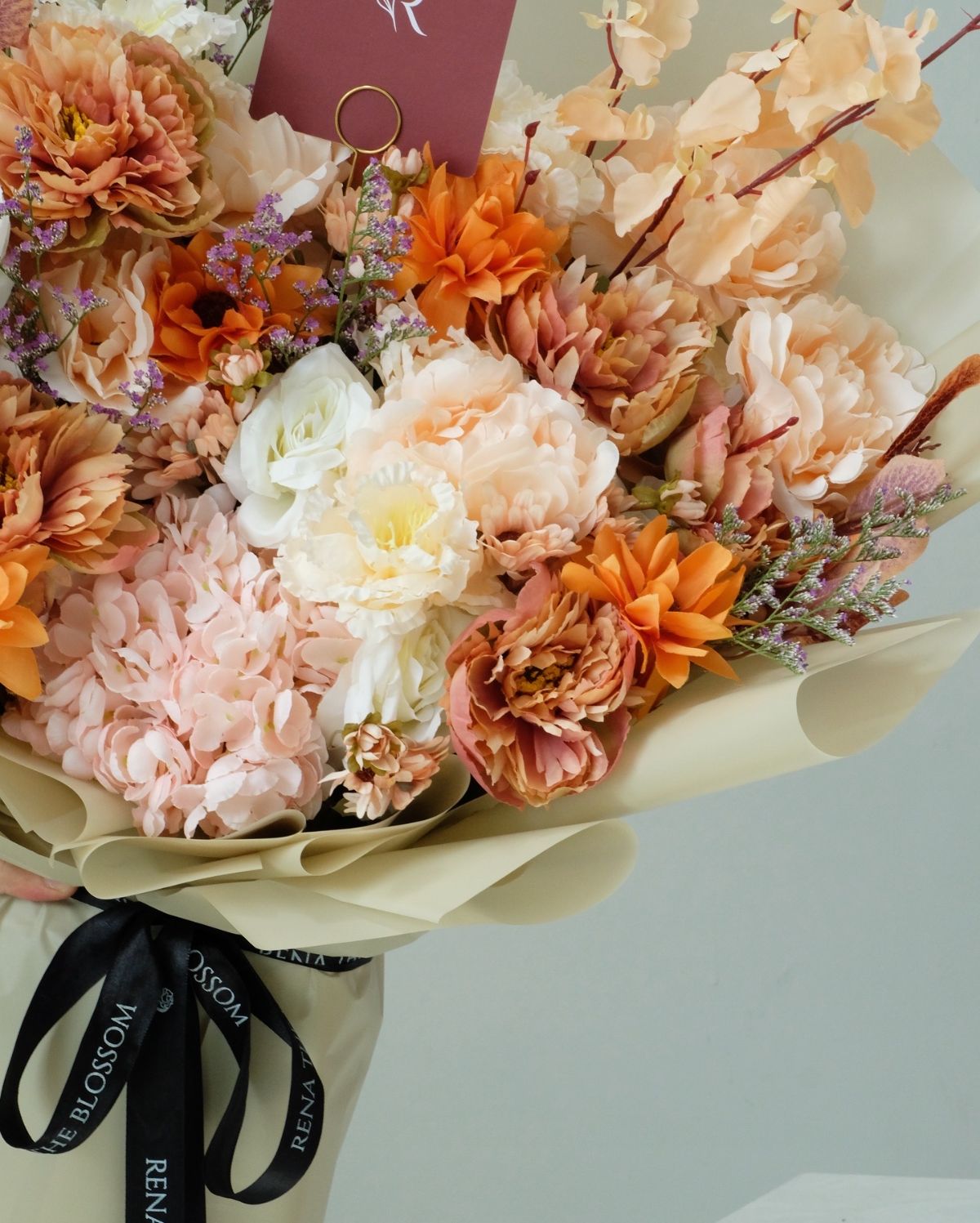 “Artificial rustic peonies, hydrangeas, caspea, autumn asters, white roses, and oncidium — autumn colours arranged in a large display that glows like a sunset that refuses to end.”