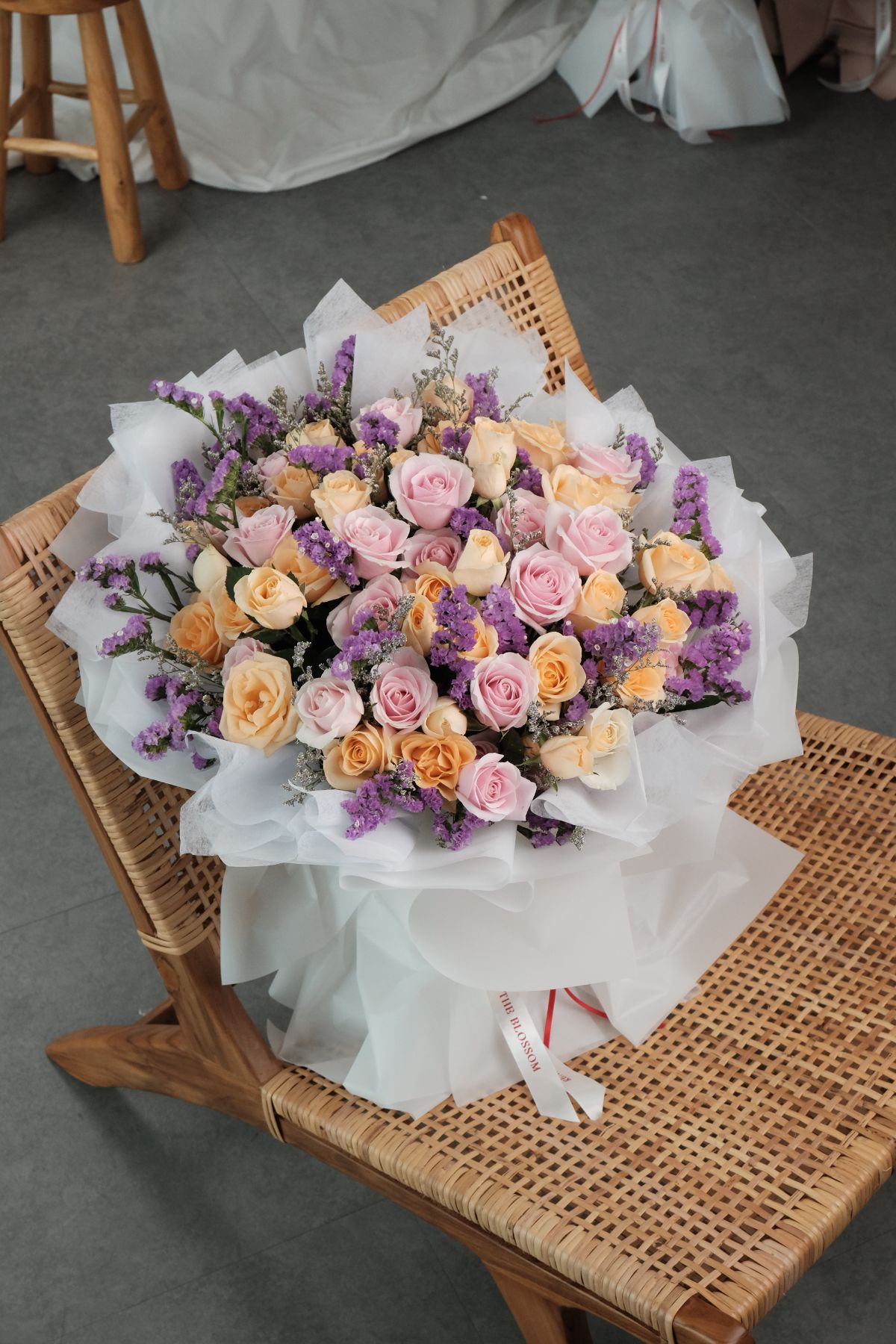 “Peach and soft pink roses, statice, and caspea — the arrangement of early morning light. Quiet, warm, and full of the gentle possibility that comes before the day begins.”